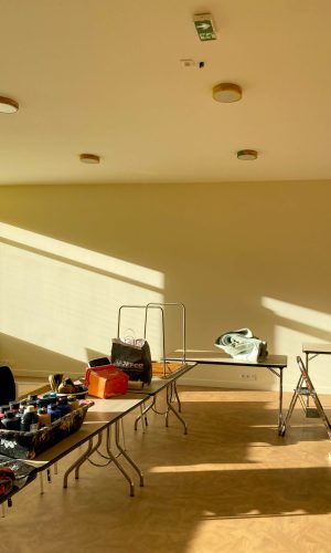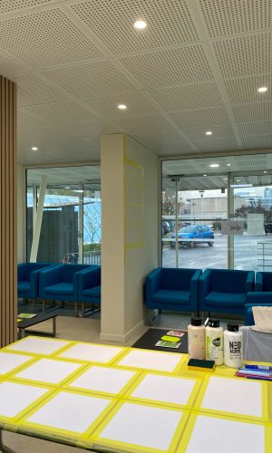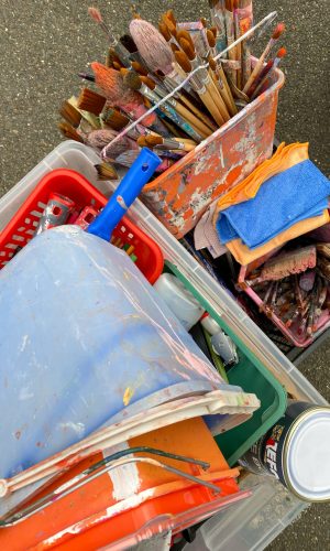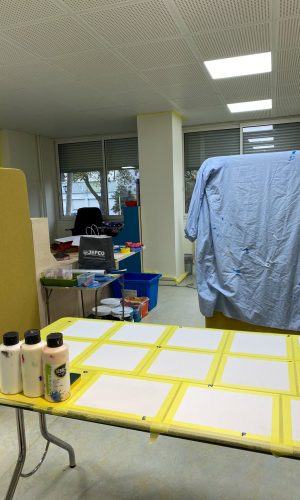Au début de Paul Peinture j’ai rencontré Mathilde avec qui nous avons mené plusieurs aventures au lycée Pape Clément de Pessac. C’étaient mes débuts et pas grand-chose ne m’arrêtait. Je vous rassure même si ça me parait déjà loin, pas grand grand-chose n’a changé. Maintenant qu’elle est installée ici lorsqu’elle m’a proposé de venir je n’ai pas hésité une minute. L’idée de se retrouver, de recréer quelque chose ensemble, de repartir de zéro, avoir une feuille blanche à remplir de couleurs et de sourires me réjouit. C’est excitant même. Loin de mes habitudes et mes repères. L’histoire ne s’écrit pas toujours comme on imagine. Mon amie n’était pas présente cette semaine même si c’est sûr qu’elle préférerait l’inverse.