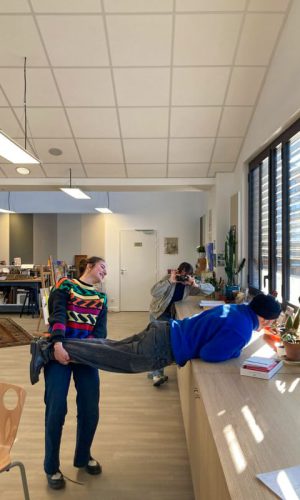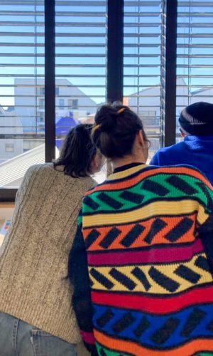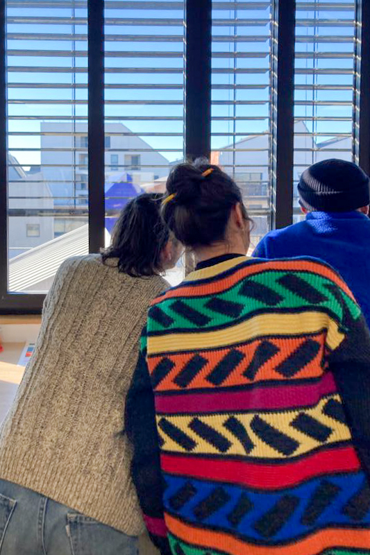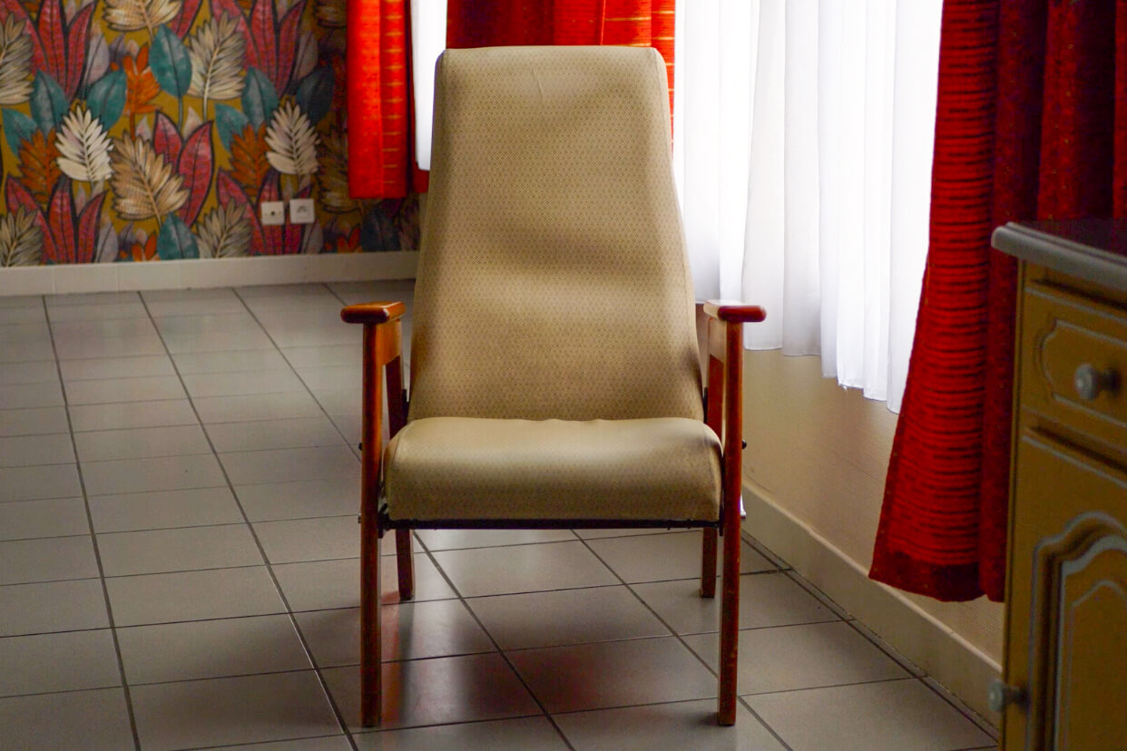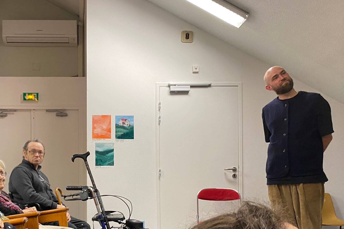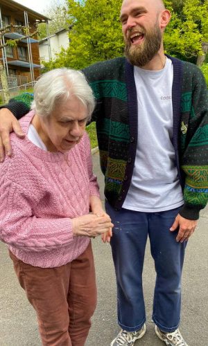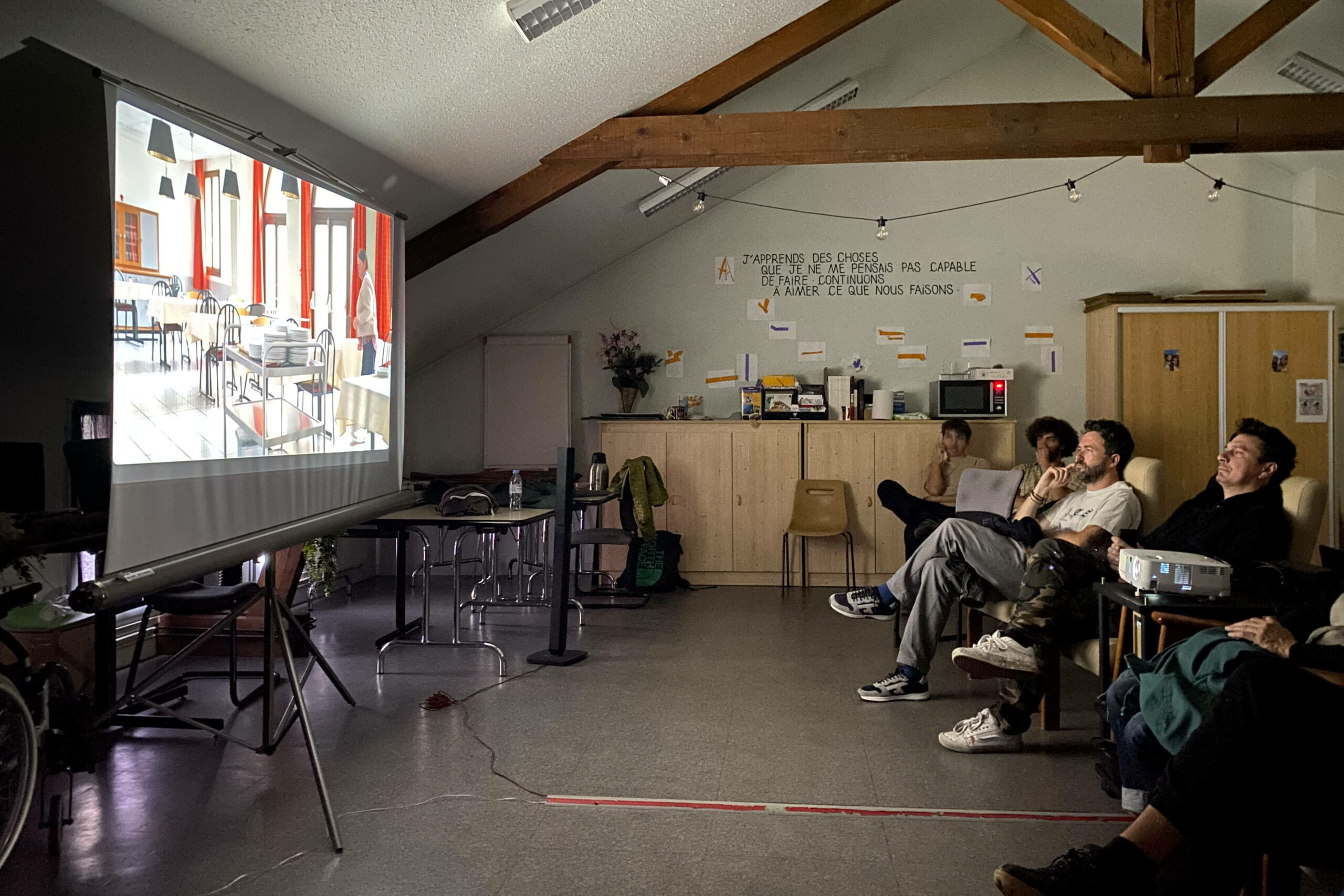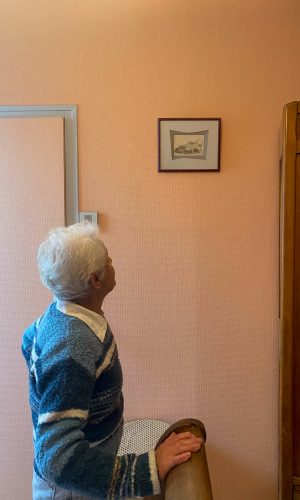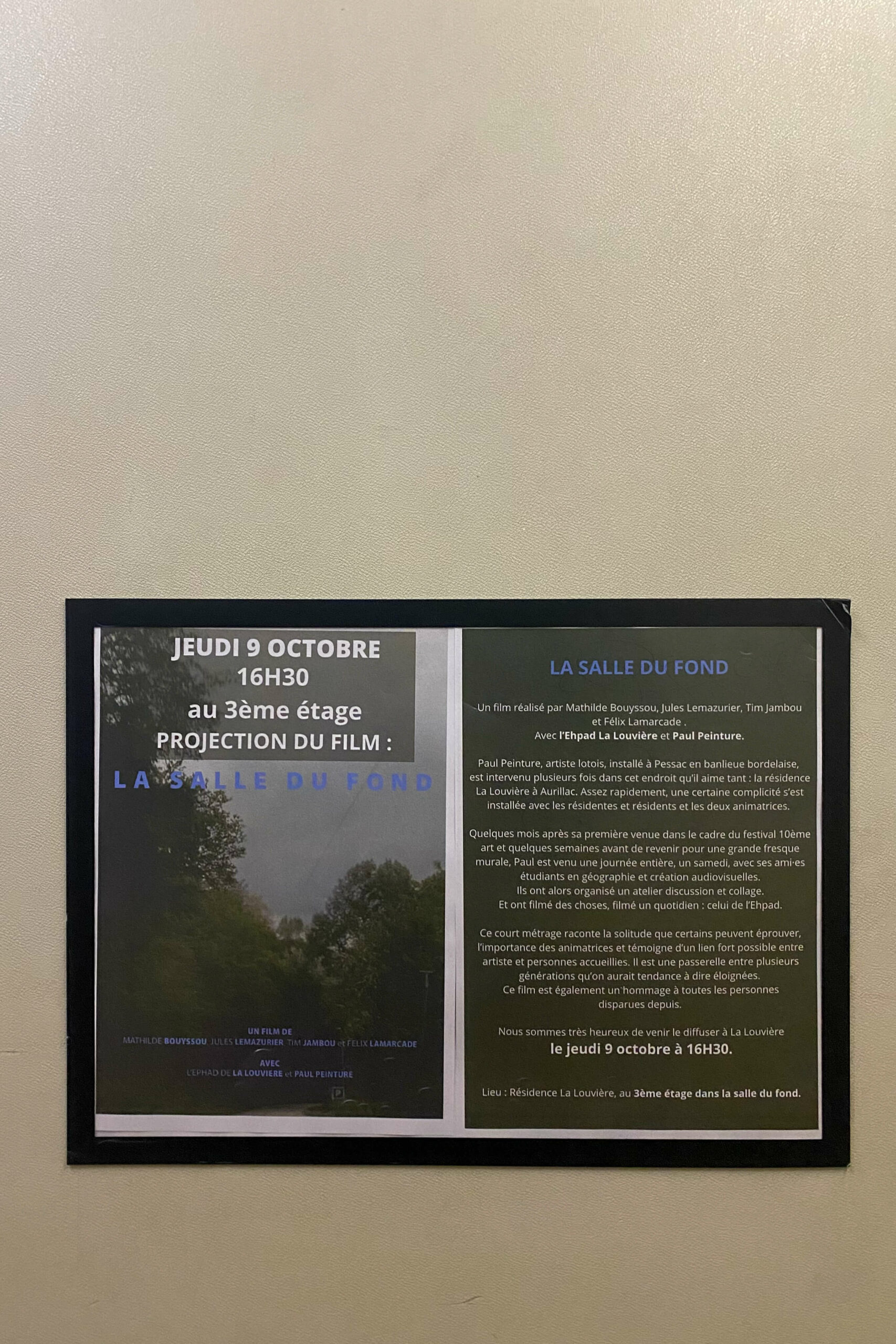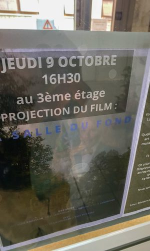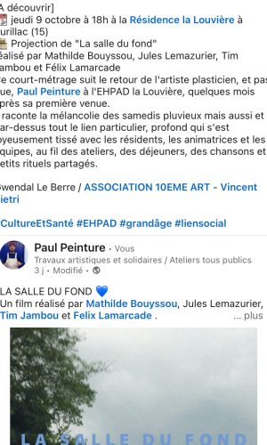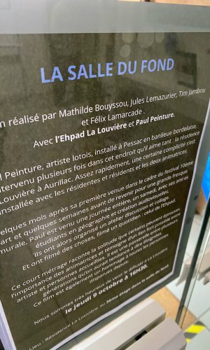 Quelques mois après ma première venue dans le cadre du festival 10ème art invité par Vincent Pietri et quelques semaines avant de revenir pour une grande fresque murale avec mon ami Ben Trakt, je suis venu une journée entière, un samedi, avec mes potes étudiant.es en géographie et création audiovisuelle. Nous avons improvisé un atelier discussion et collage, filmé des choses, filmé un quotidien : celui de l’EHPAD.